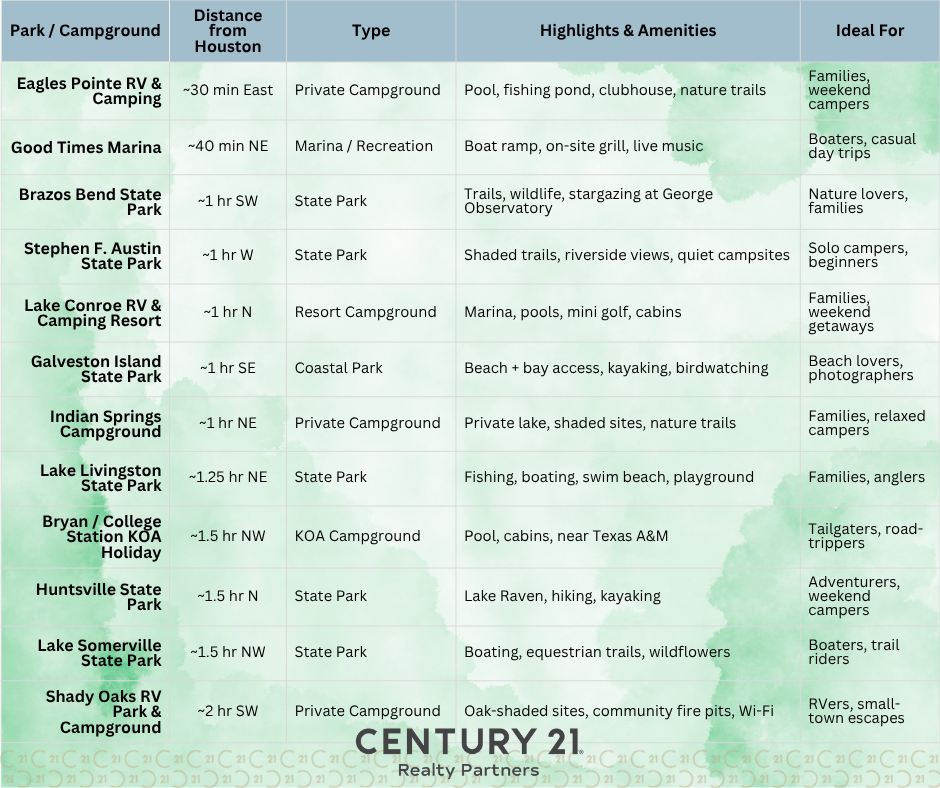 Whether you’re craving a quiet afternoon under the trees or a weekend under the stars, the Houston area is surrounded by parks and campgrounds that make escaping the city a breeze. From family-friendly green spaces with splash pads and BBQ pits to lakeside campsites with hiking trails and fishing docks, there’s something for everyone just a short drive from H-Town.